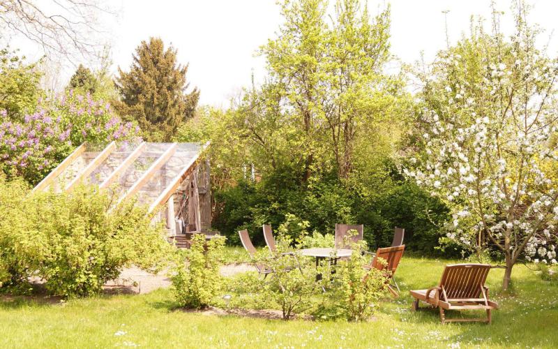 Ein kleiner Teil des großes Garten ist extra für sie reserviert. An der Südseite des Hauses haben sie eine Sitzeck, wo sie ihren Nachmittagskaffee genießen oder den Grill anwerfen können.